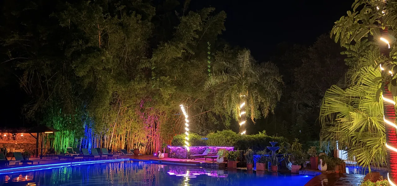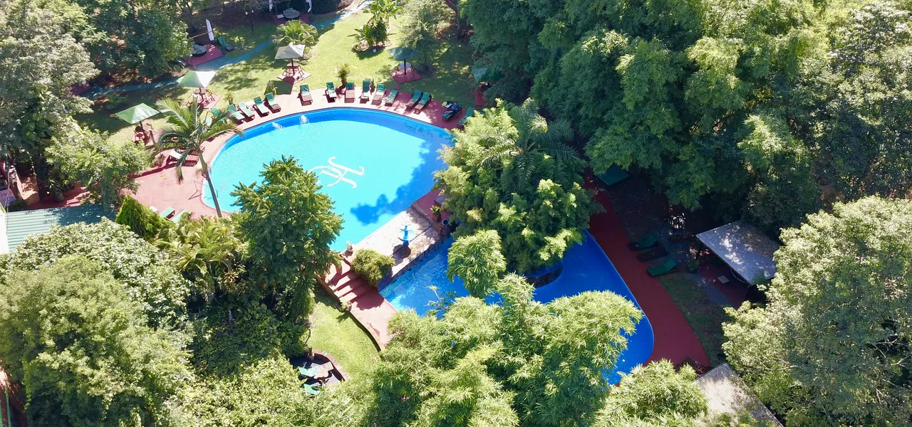 Dos piletas rodeadas de un gran parquizado con reposeras donde podra disfrutar con vistas a la selva.